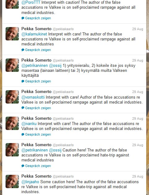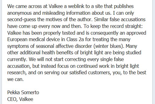 At the end of August, people were tweeting a link to this site. Valkee's CEO, Pekka Somerto, got nervous and started spamming those who shared the URL. On August 29th, Valkee made an official statement on it's Facebook page. It did not contain the link, and had no factual information, just like some random politician- or commercial-style press text: