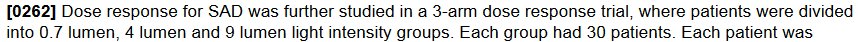 One person dropped out early, so the final number was 89. One group got earlight with about the same intensity as used in Valkee's previous trials (9 lumen). The second group got half of it (4 lumen). Because the treatment had to be applied at home, the participants must be prevented from identifying the placebo. So the third group got a placebo light with 1 lumen. Valkee's researchers knew from previous tests, that this intensity has no clinical effect. A recent patent application reveals, that the exact intensity has been 0.7 lumen.44