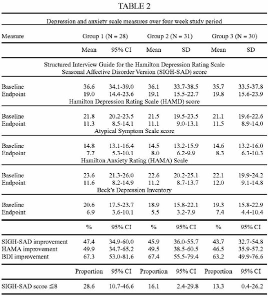 Earlight was applied daily for 12 minutes, over 4 weeks. SIGH-SAD/HAMD, HAMA, and BDI scores were collected at study start and end (BDI every week). The primary outcome, the change in the SIGH-SAD score, was the best in the placebo group, and the lowest improvement was seen in the 9 lumen group.
