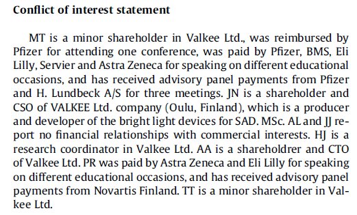 In spring 2007, their company Valkee Ltd. was founded to further develop (industry speak for to market) the device. 3 Valkee aimed to produce supporting evidence, a challenge for an invention unknown to the scientific community, made by non-medical outsiders, with a complete lack of basic research, not a single article ever written about the topic. They had to make the thing look like something scientific.