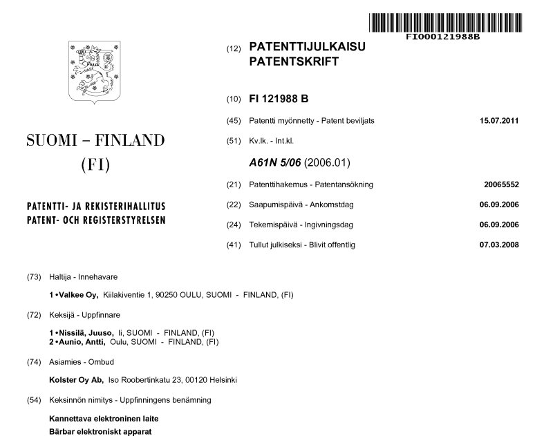 1 Finnish patent 121988B, issued on Jul 15, 2011, recieved first on Sep 6, 2006; PDF on file. -see picture-